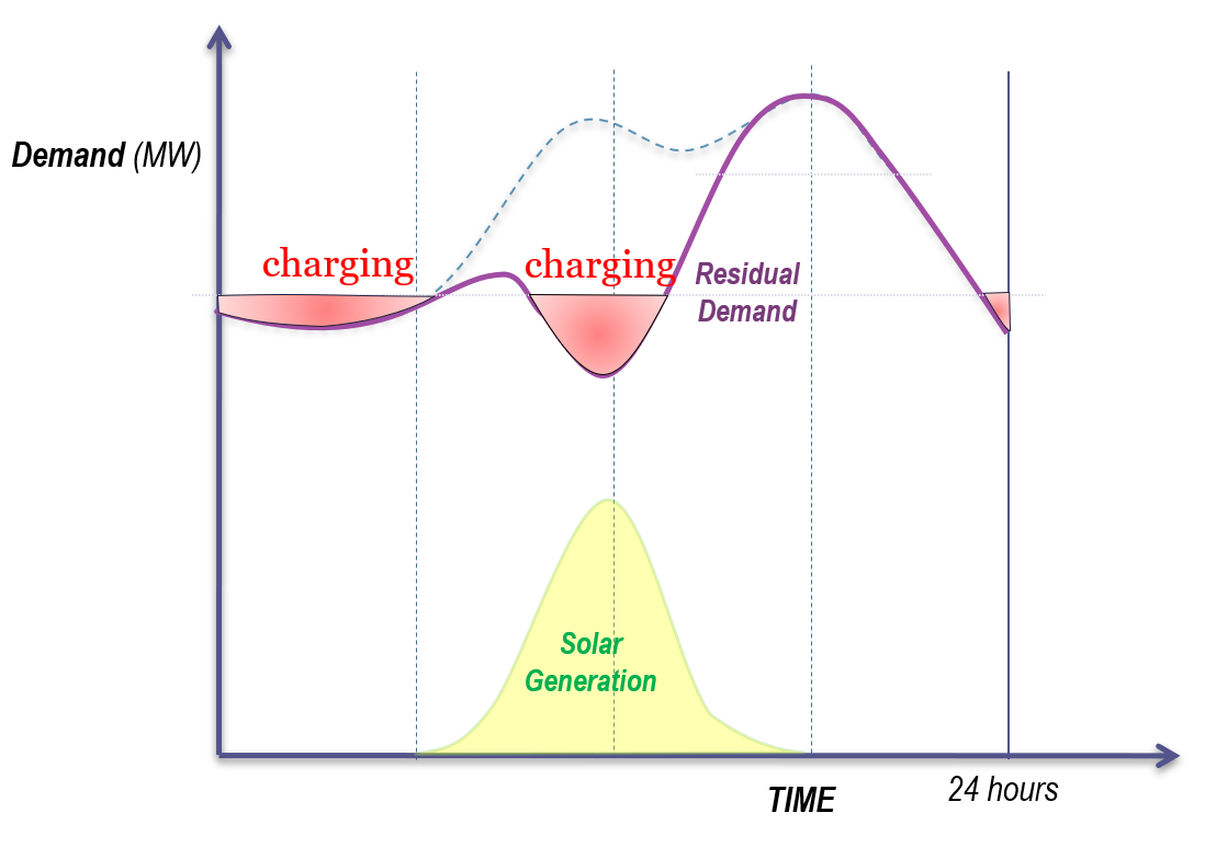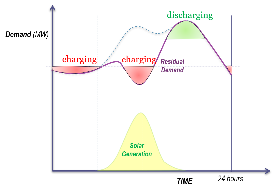 - Charging: The battery operates as a load, charging during the daytime periods when demand is low and solar energy depresses the market price.