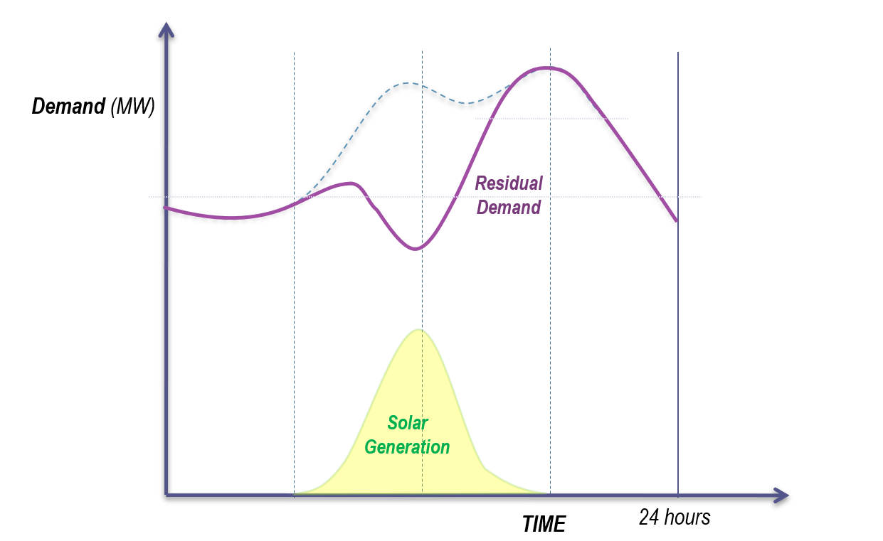 - As the sun sets and the evening peak begins, the system must rely heavily on expensive peaking stations to satisfy the sudden spike in net demand.